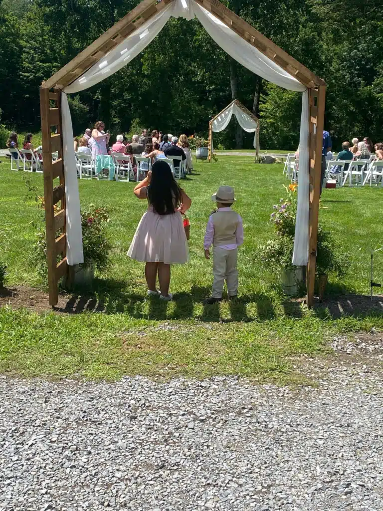 Andelyn Farm's wildflower field or natural woodlands are perfect locations for small and intimate ceremonies surrounded by natural beauty. A charming decorative wedding arch is available along with seating for all guests.